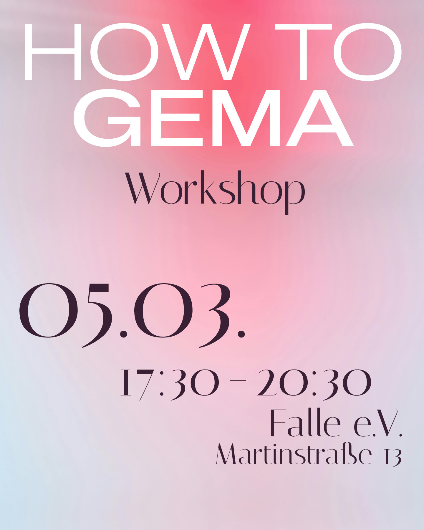 GEMA – ein Thema, das viele junge Kollektive und Veranstalter:innen verunsichert. Muss ich anmelden? Wenn ja, wie? Wer zahlt? Welche Tarife gelten überhaupt? In diesem Workshop geben wir einen verständlichen Überblick zur GEMA-Anmeldung für Veranstaltungen mit Musik.